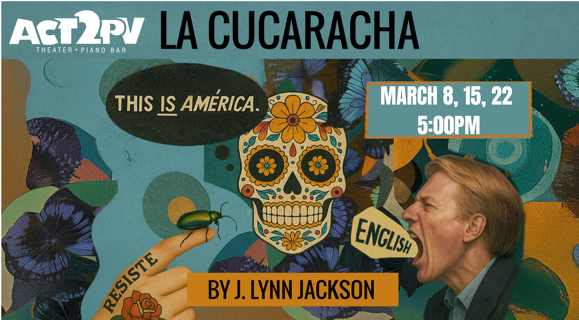 J. Lynn Jackson’s “sharp, hilarious and dangerously timely” new stage play directed by Alfonso López is presented on the ACT2PV Main Stage in English, Sundays at 5pm March 8, 15 and 22.