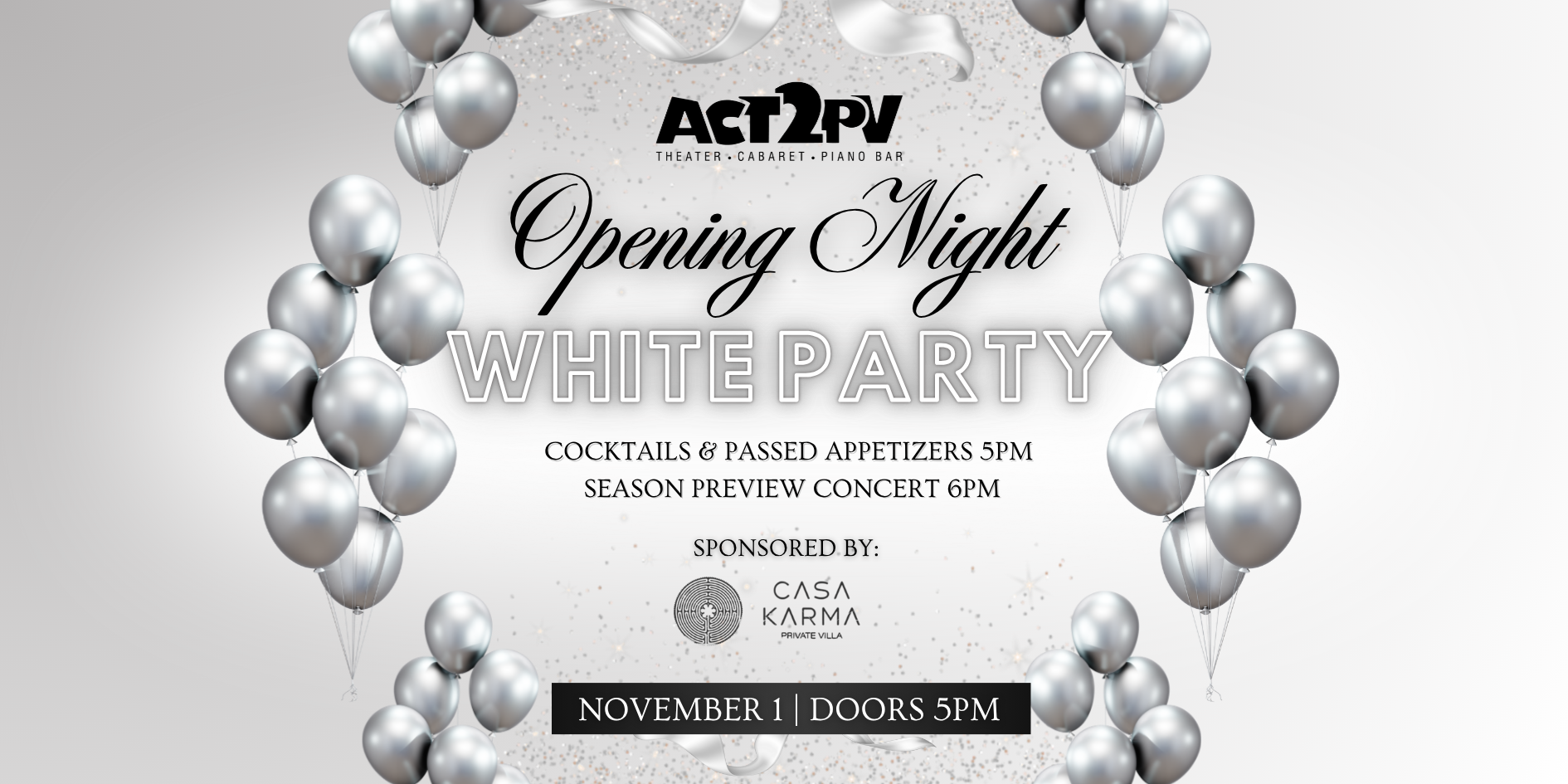 We invite you to join us for an unforgettable evening of sophistication and style at Act2PV’s All-White Gala on Wednesday, November 1—a dazzling celebration of the launch of our brand-new season! (This event is sponsored by Casa Karma.) ✨